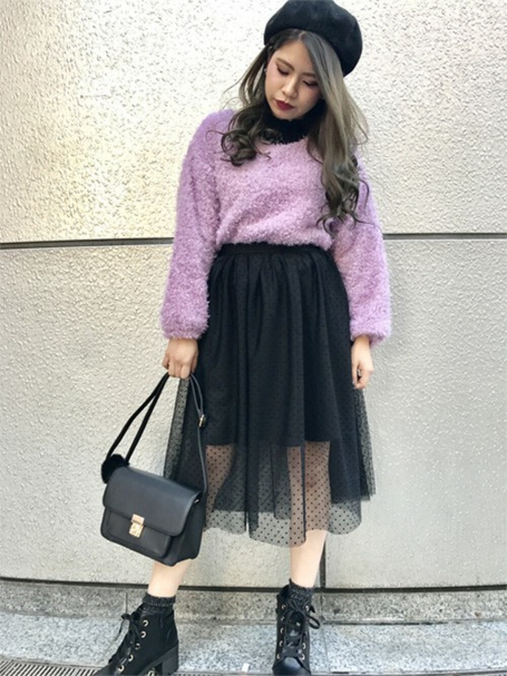 起毛レースのトップスをループファートップスのインナーとして重ね着をし、首元が一気に華やかになる今期イチオシのコーディネートです。 さらに同じお色味で透け感のあるチュールスカートを合わせ、重ね着も重く見せず、さらに可愛さをプラスしてみました!
