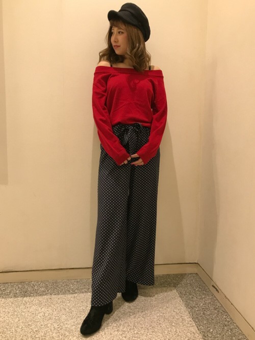 ビビットな赤はコーデにメリハリがでてレトロガーリーなドット柄との相性が可愛いです!