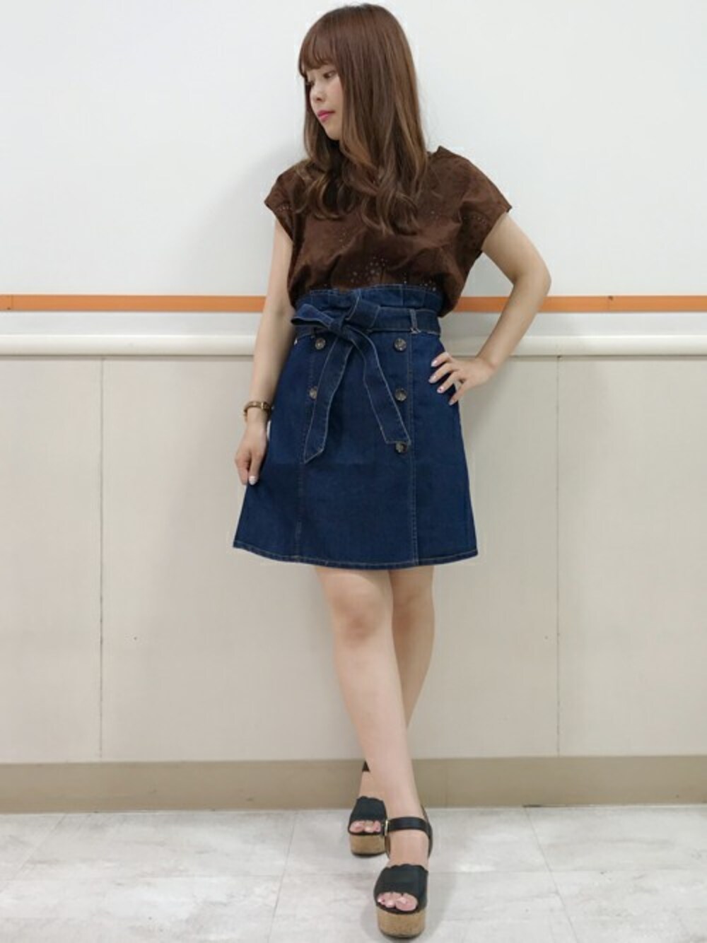 パンチングレースのブラウンは大人っぽくキレイめになり、袖もフレンチスリーブのため肩が隠れ腕が細く見えます。 ミニボトム合わせでもまとまるのでおすすめです!
