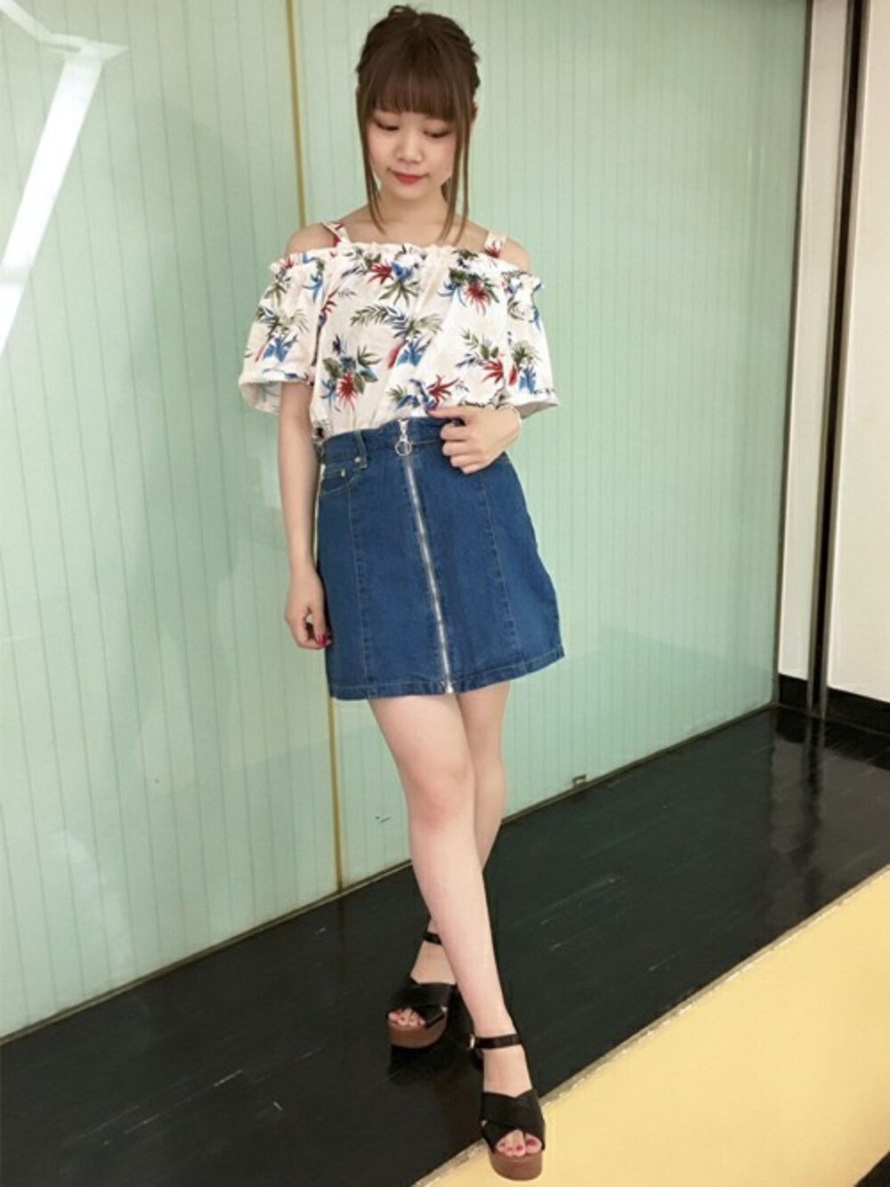 夏にぴったりなリーフ柄デザインのオフショルはさらっとした素材で着心地も抜群です!ミニボトムで涼しげなコーデにしました。