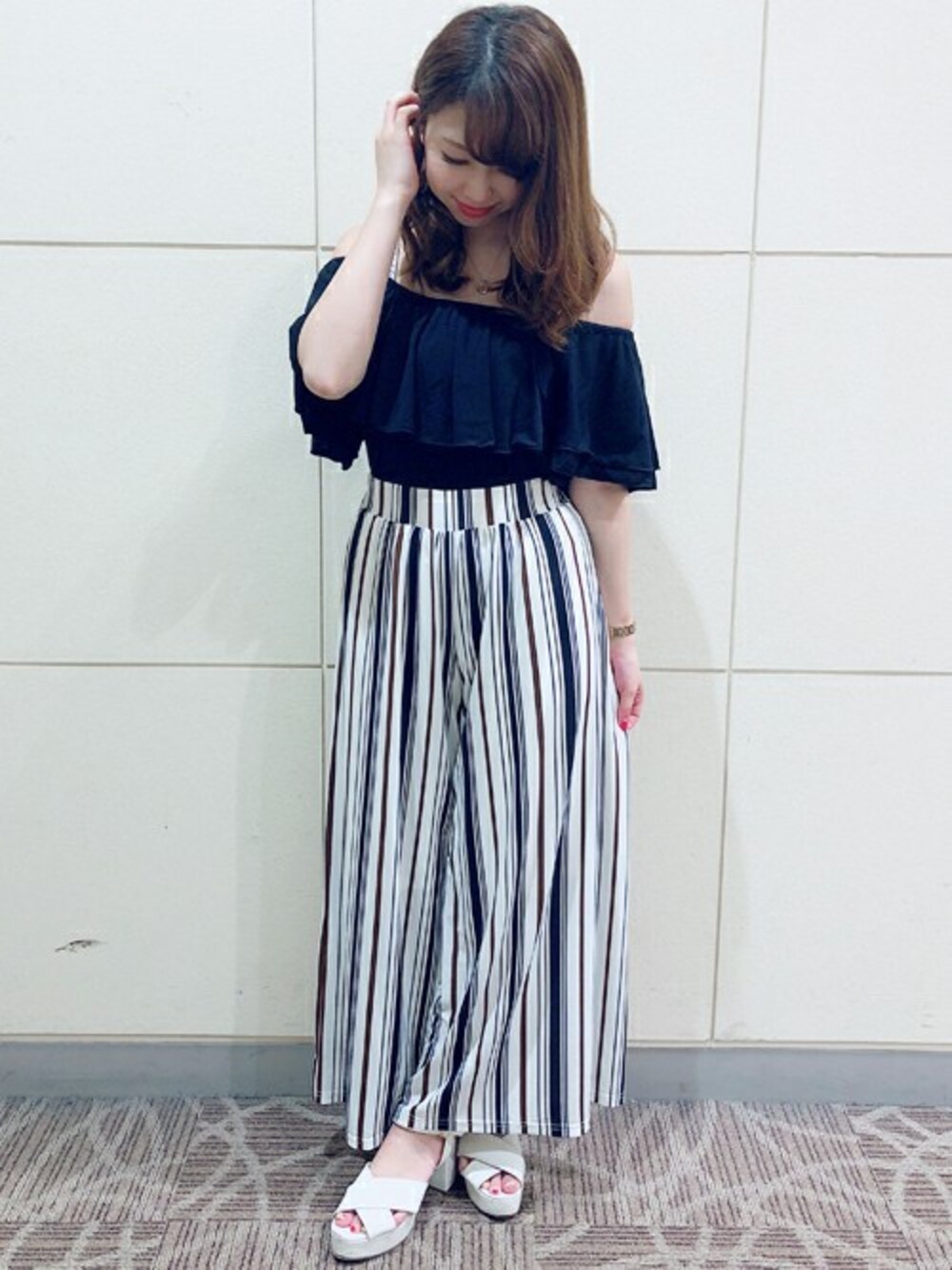 ワイドパンツはマルチストライプなのでお洋服のアクセントになります! フリルのTOPSと合わせ、上はボリュームありなコーディネートで下半身が細く見えるコーディネートにしました!
