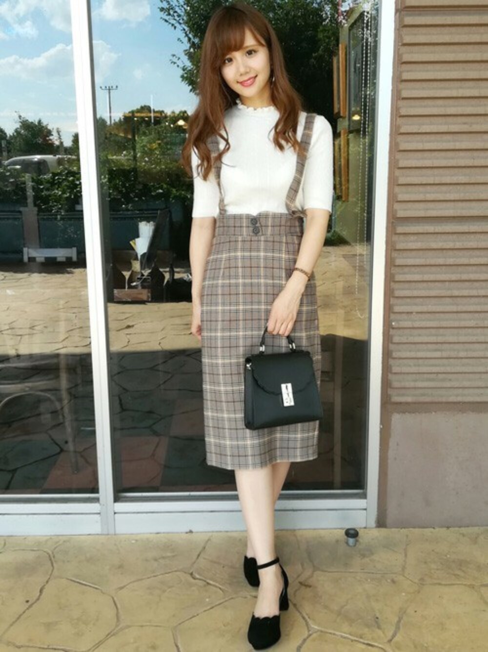 ニット×チェック柄SKを合わせ女の子らしさ満載のコーデに★サス付ですが取り外しもでき、2wayで楽しめるアイテムです♪