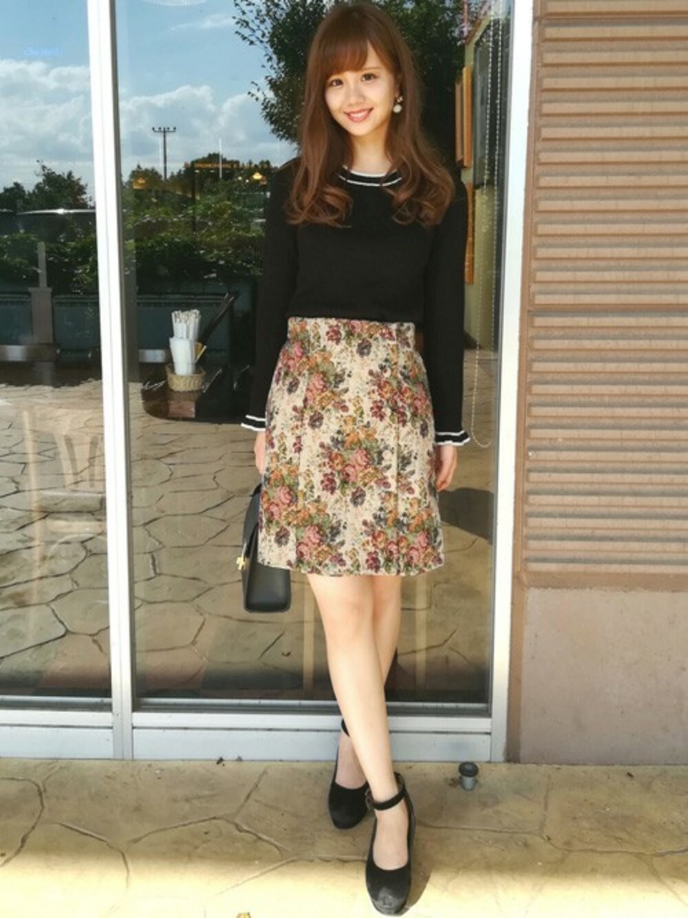 今年トレンドのライン入りニットは、袖がフリルになっており可愛らしい印象を与えてくれます★花柄のゴブランスカートを合わせ、トレンド満載のコーデにしてみました♪