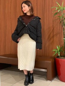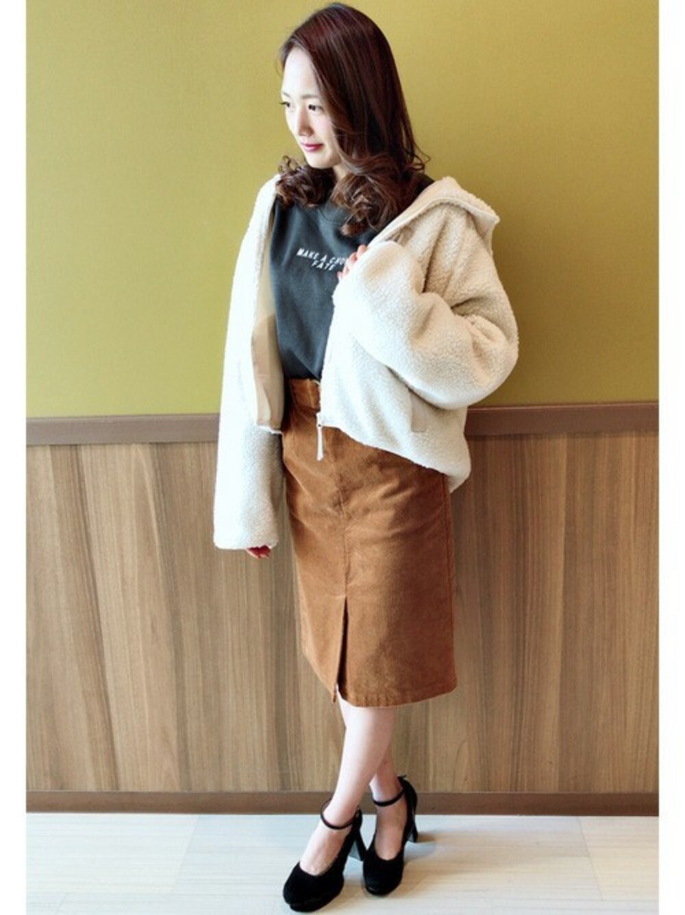 今年流行りのちびロゴトップスにナローSK合わせで少し大人っぽく見せ、更に今年トレンドのボアパーカーブルゾンは肌触りも良くこれからの時期に大活躍なアイテムです!