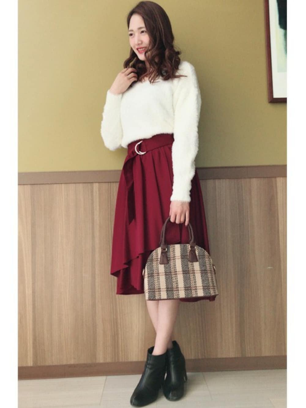 フェザーニットは肌触りが良く一枚でも充分温かいニットです!ボルドーのスカート合わせで大人っぽく飾れます♪小物を取り入れるだけで更にオシャレに!