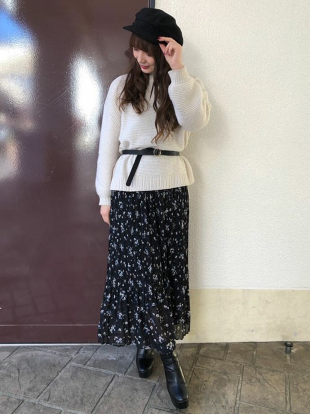 小花柄と細めのプリーツが春らしいこちらのスカートは、チュニック丈のニットにベルトでウエストマークすることで今年らしい着こなしに♪ウエストは総ゴムなので着心地も抜群です♪