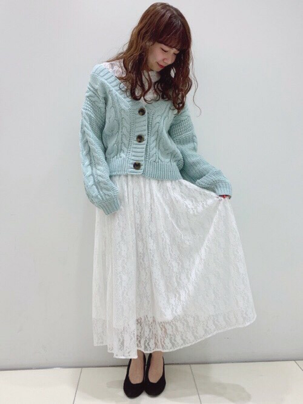 ガーリーなレースアイテムに爽やかなミントグリーンのカーディガンを合わせて大人ガーリーに仕上げました。カーディガンは春もまだまだ大活躍してくれます!