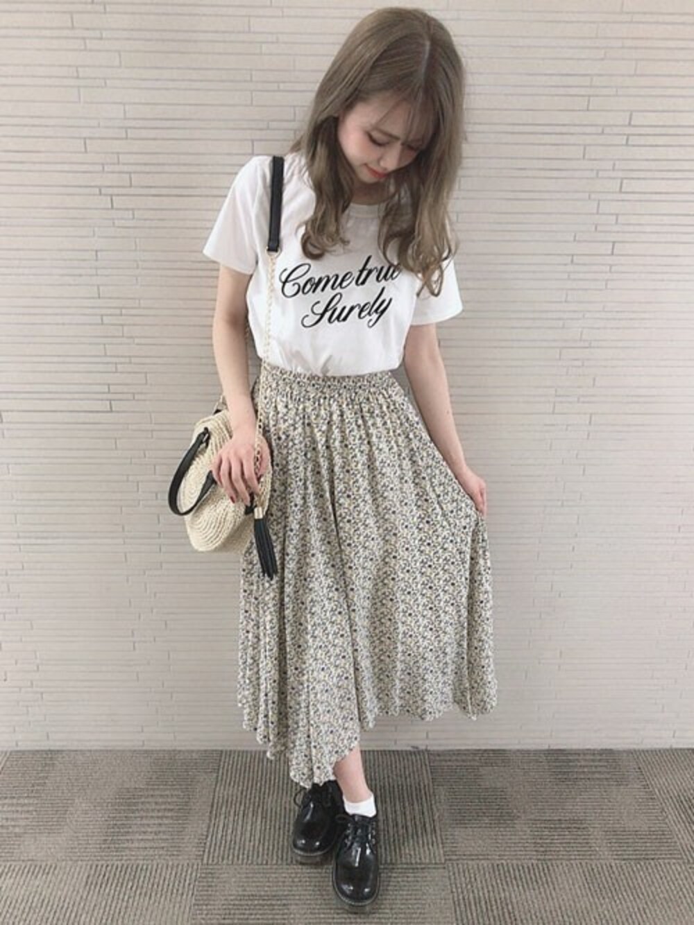 スカートはウエスト部分はゴムで着心地良く丈の長さも丁度よく足首がスッキリ見えます!シンプルなTシャツと合わせて春夏っぽくしてみました!