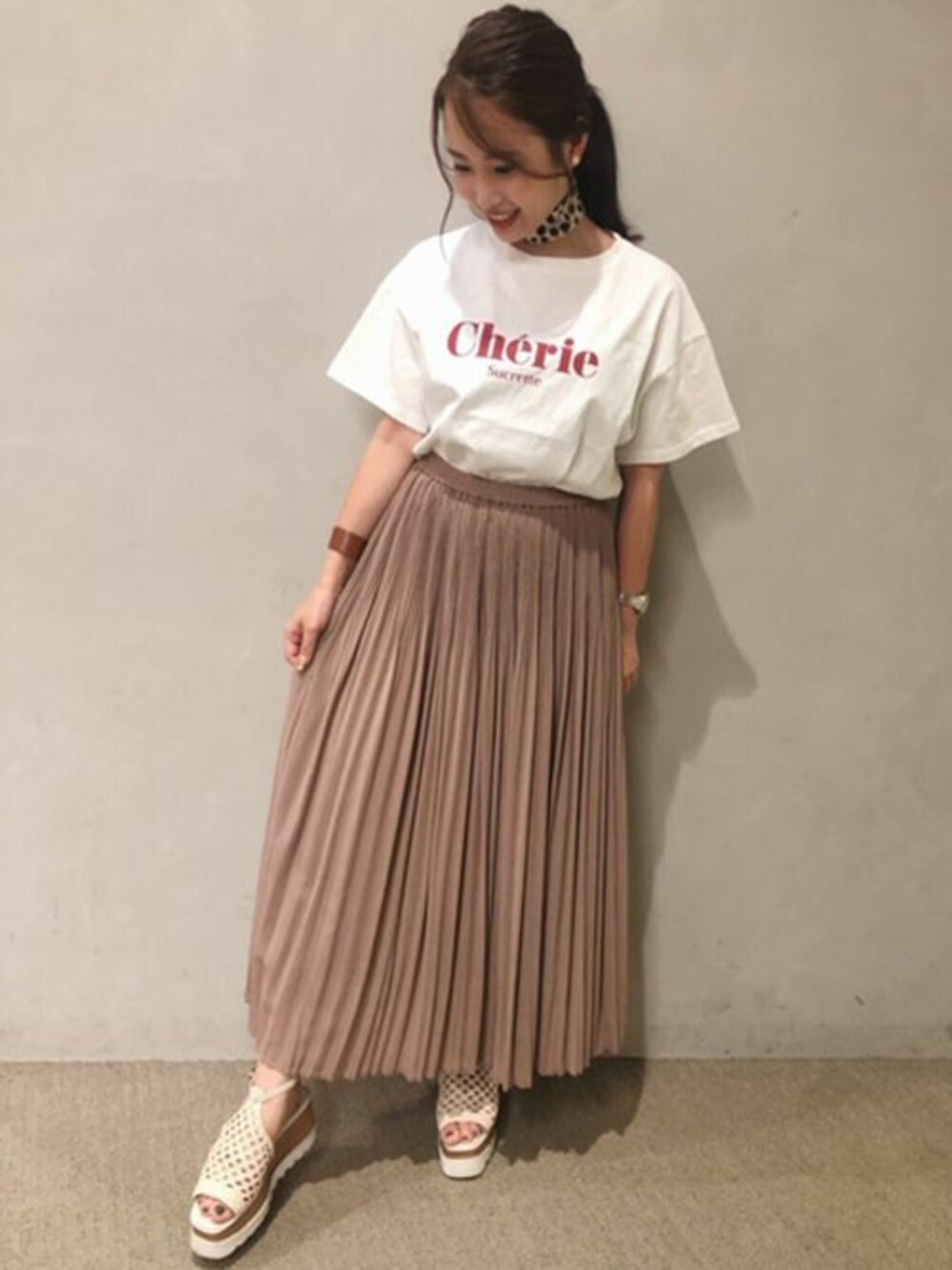 やわらかすぎないしっかりしたシルエットのTシャツなので、一枚あれば重宝できます!ロゴT×プリーツスカートでこなれ感◎スカーフを巻いてトレンドコーデにしました。