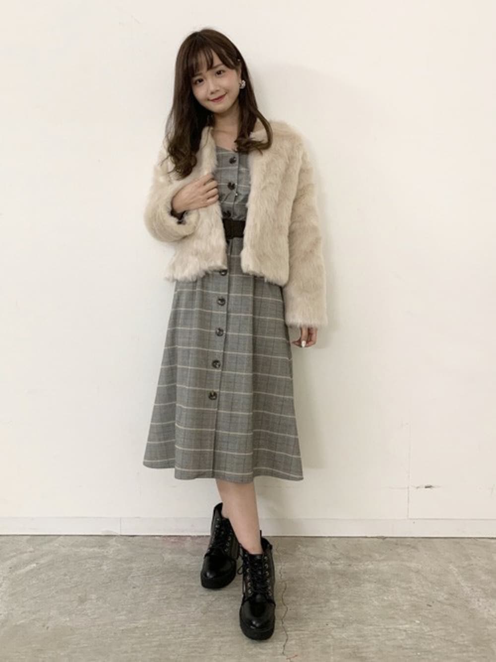 チェック柄のワンピは、ベルト付なのでスタイルUP効果も★ノーカラーのファーコートを合わせ、冬先取りコーデに。