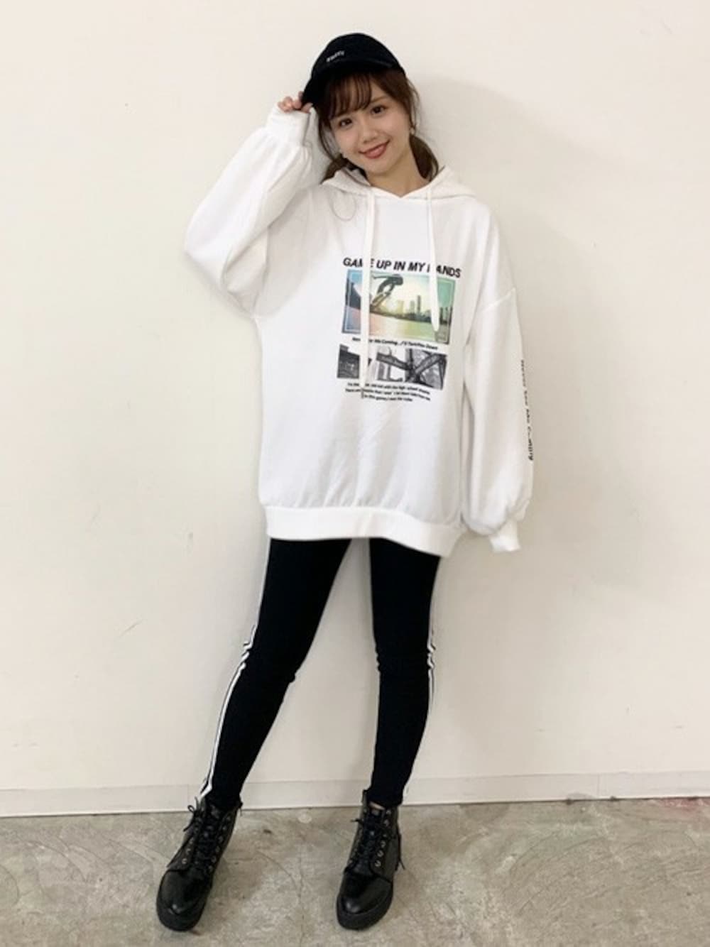 INGNI(イング)(INGNI 東京本社)のパーカー「裏起毛フォトプリント袖ロゴチュニックパーカー」を使ったコーディネート
