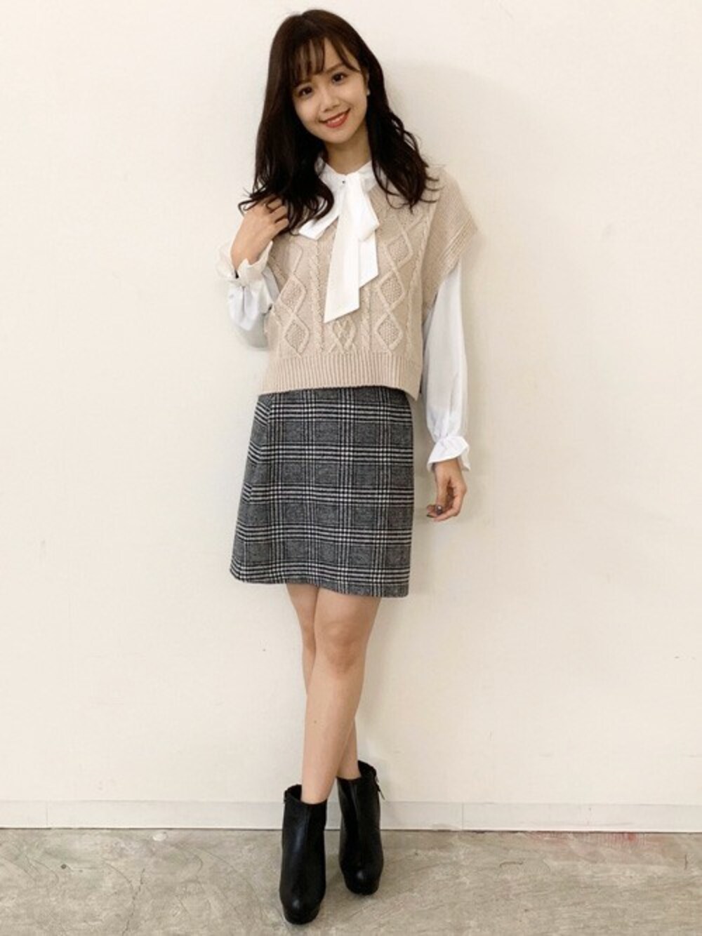 ニットベストにチェック柄スカートを合わせ女の子らしさ満載のコーデにしてみました。トレンドのニットベストは、ミディスカート合わせでも大人可愛くお召し頂けます。