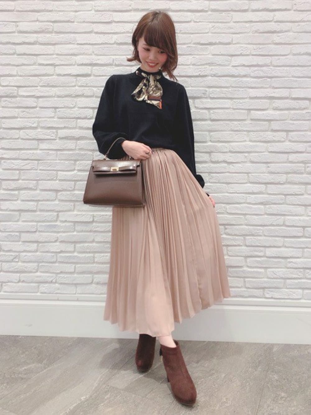 今季のスカーフ付ニットはお袖がボリューム袖になっていて、ニット1枚で可愛くオシャレに着こなすことができます!今回はロングスカートと合わせてちょっぴり大人めコーデに。