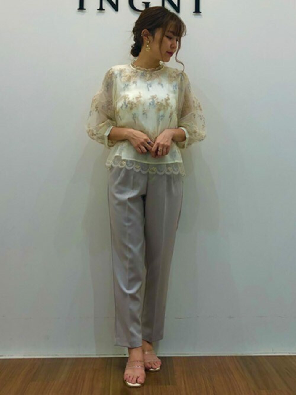 刺繍のトップスは綺麗目で上品でかなりの高見えアイテムです!パンツスタイリングにすればオフィスカジュアルとしても着用できます♪