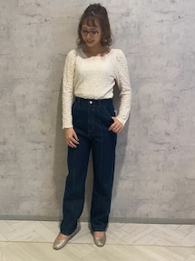 大きなフリルがついたブラウスはパンツと合わせて今年っぽく。