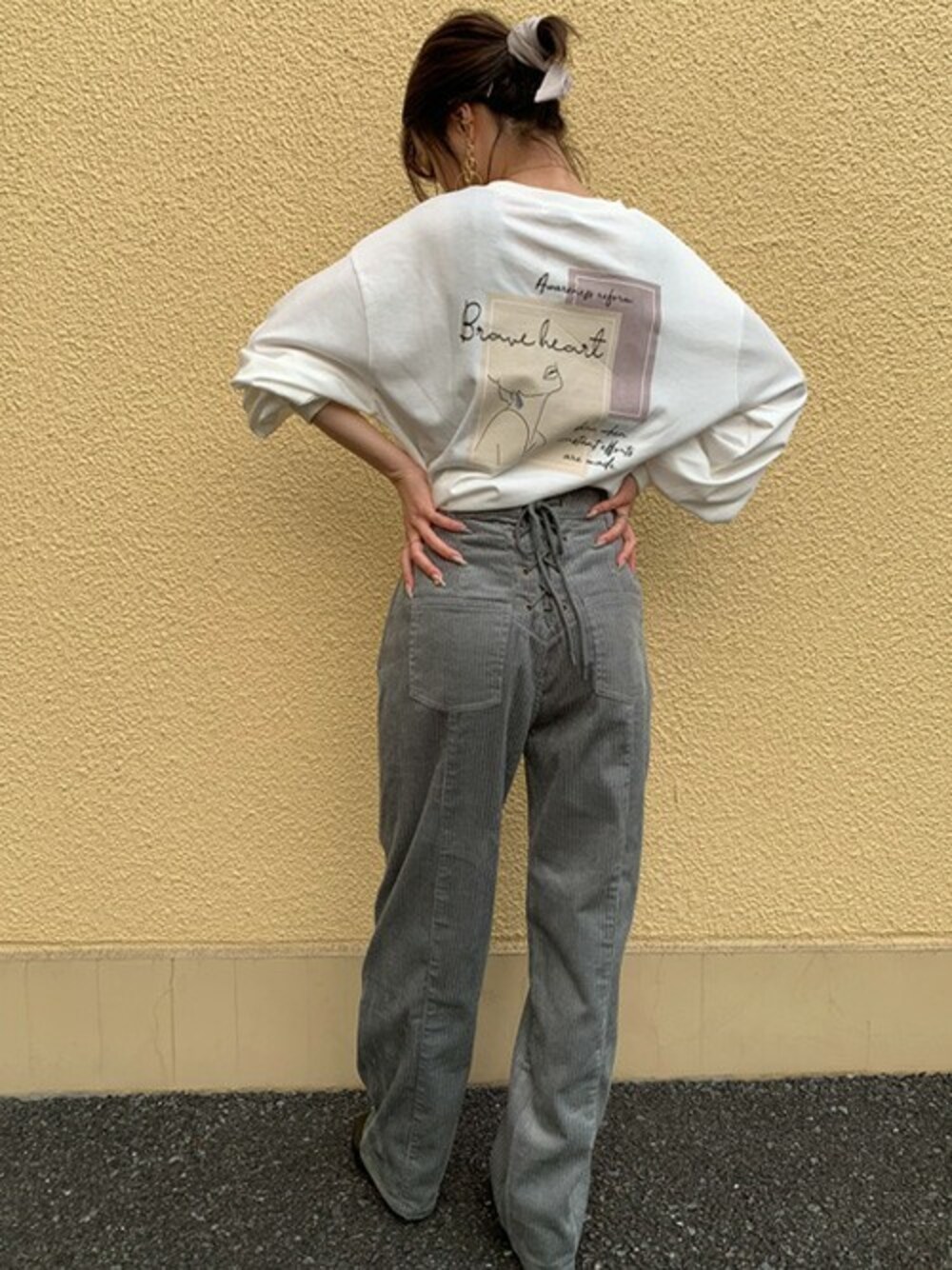 トップスはゆったりとしたサイズ感で着やすく、ボトムはコーデュロイ生地ですが軟らかく、動きやすいです。バックシルエットが可愛いコーディネートです!