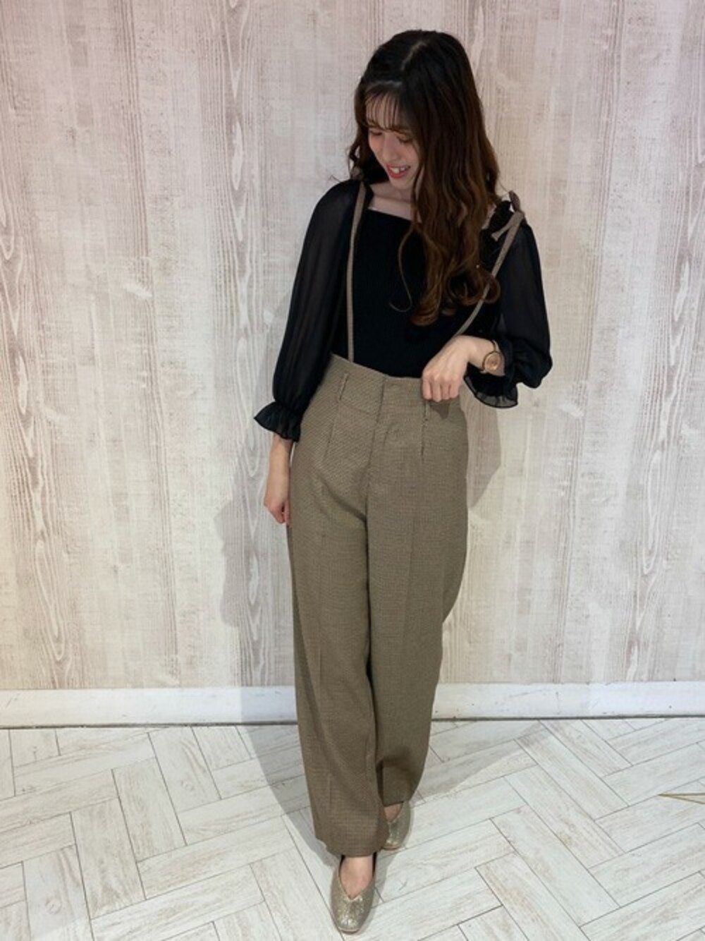 サスがお洒落なパンツは異素材ニットと合わせてトレンドコーデに!