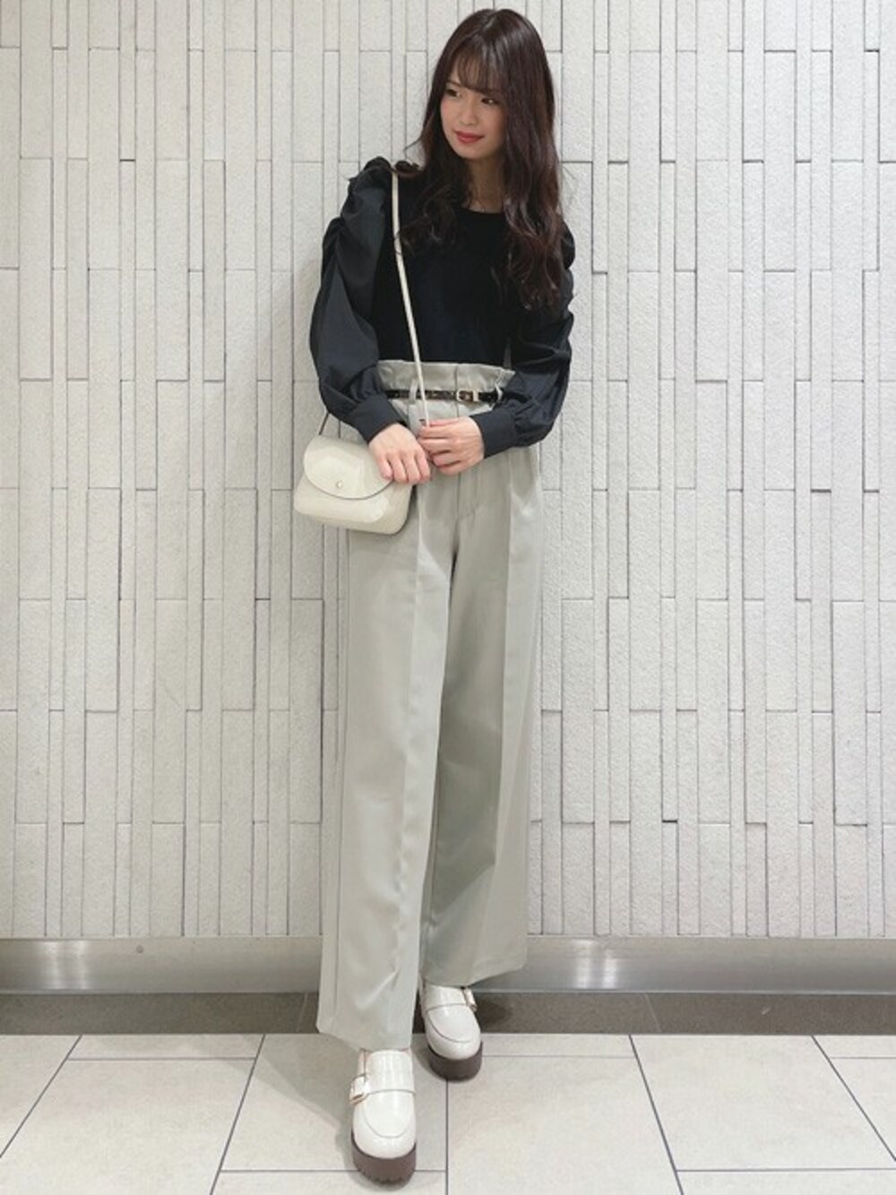 バックリボンのトップスに、ボトムをパンツ合わせにする事で甘くなりすぎず、プレスされたセンターラインが脚を綺麗に見せてくれます♪小物はアイボリーでまとめて統一感を出してみました
