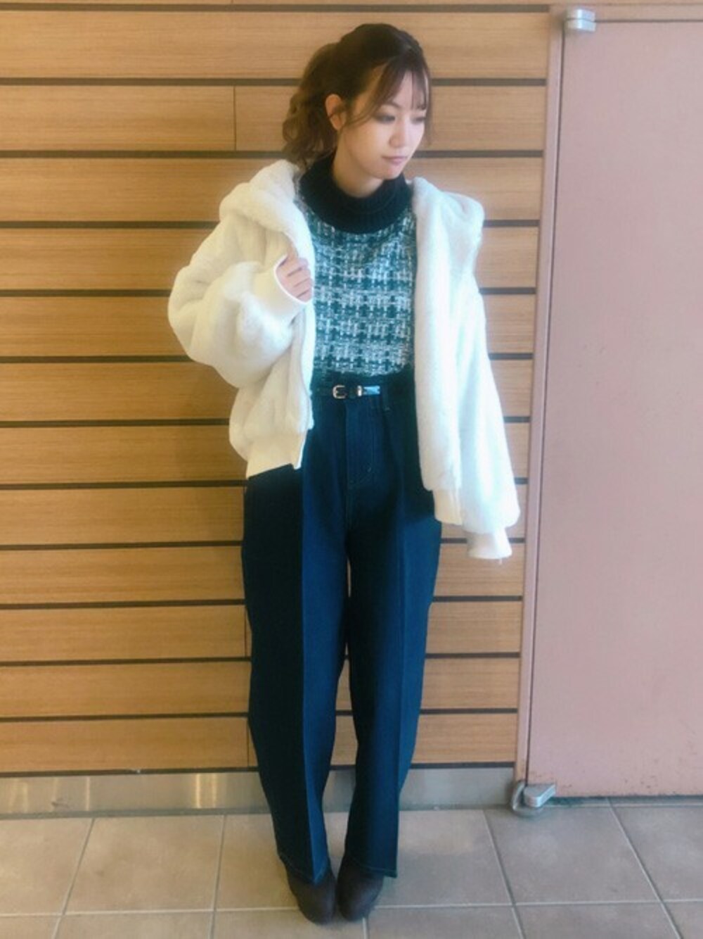 ハイネックの首元がトレンドで可愛く、丈感短めのニットですので、インスタイルでもアウトスタイルでも着こなして頂けます。ツイードニット×︎デニムで甘辛コーデを意識しました。