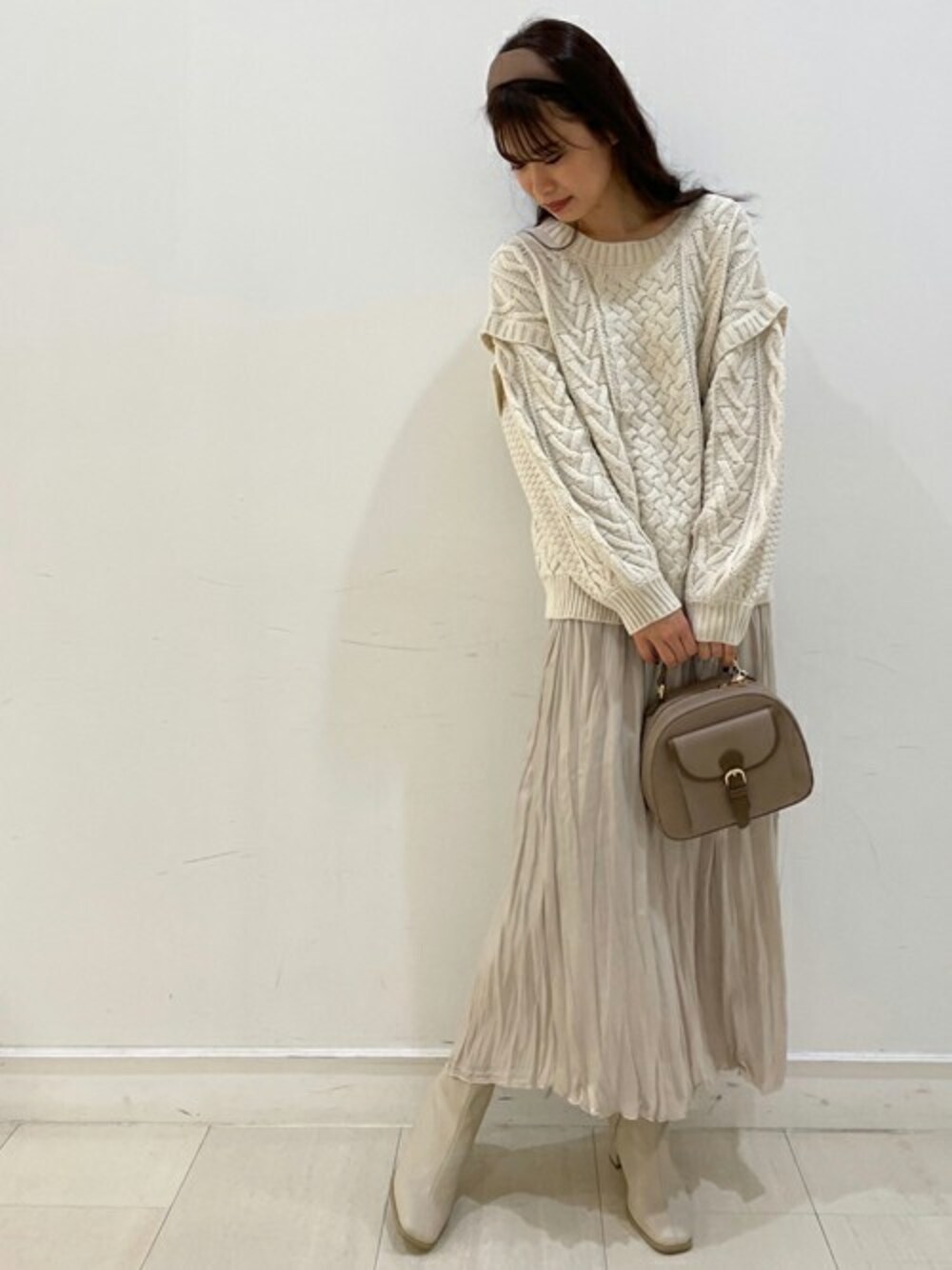 暖かみのあるニットと相性は抜群でアイボリーのワントーンコーデでガーリーにしてみました。春先にはシャツやブラウスとの組み合わせもオシャレで可愛いです