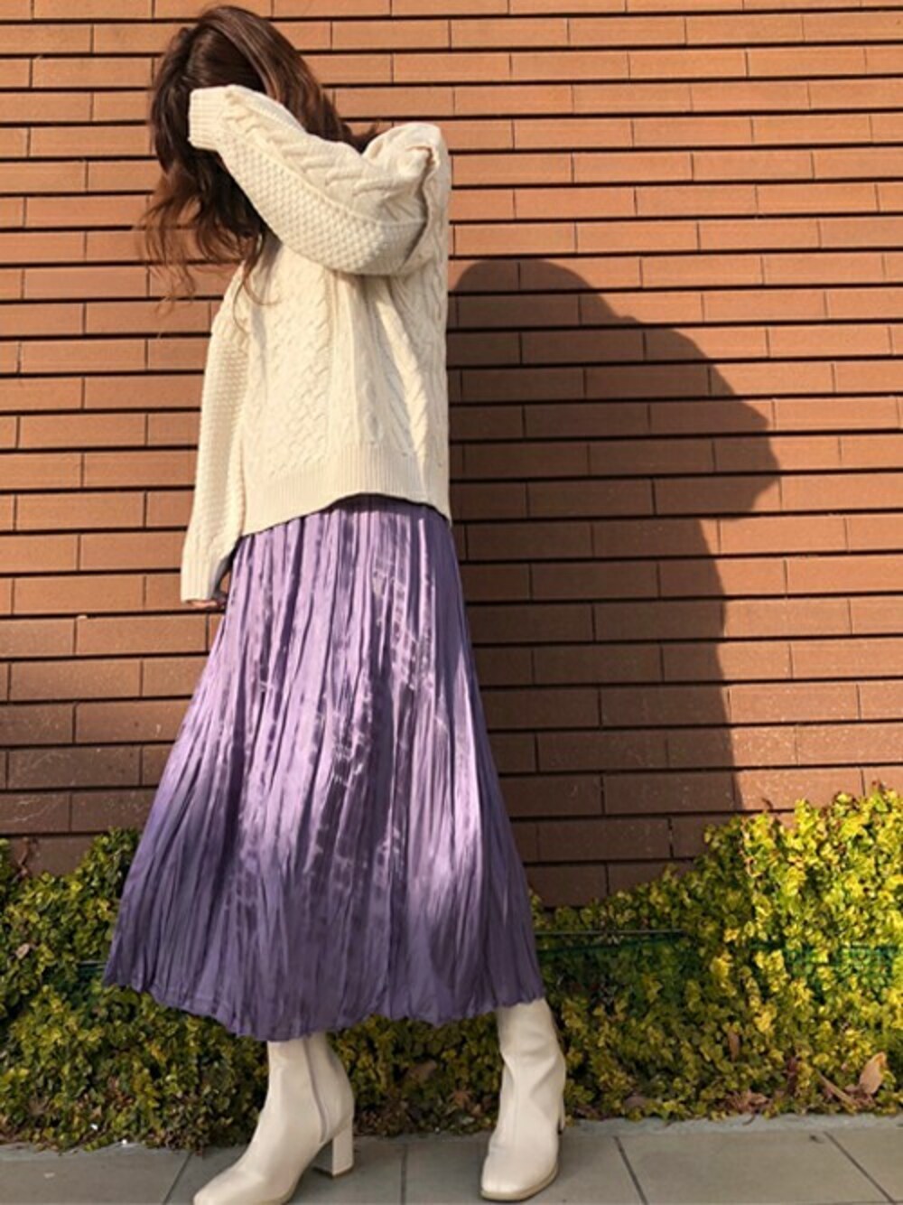 カラーのプリーツスカートで今年っぽく☆ニットとブーツをアイボリーで合わせてスカートを主役に♪