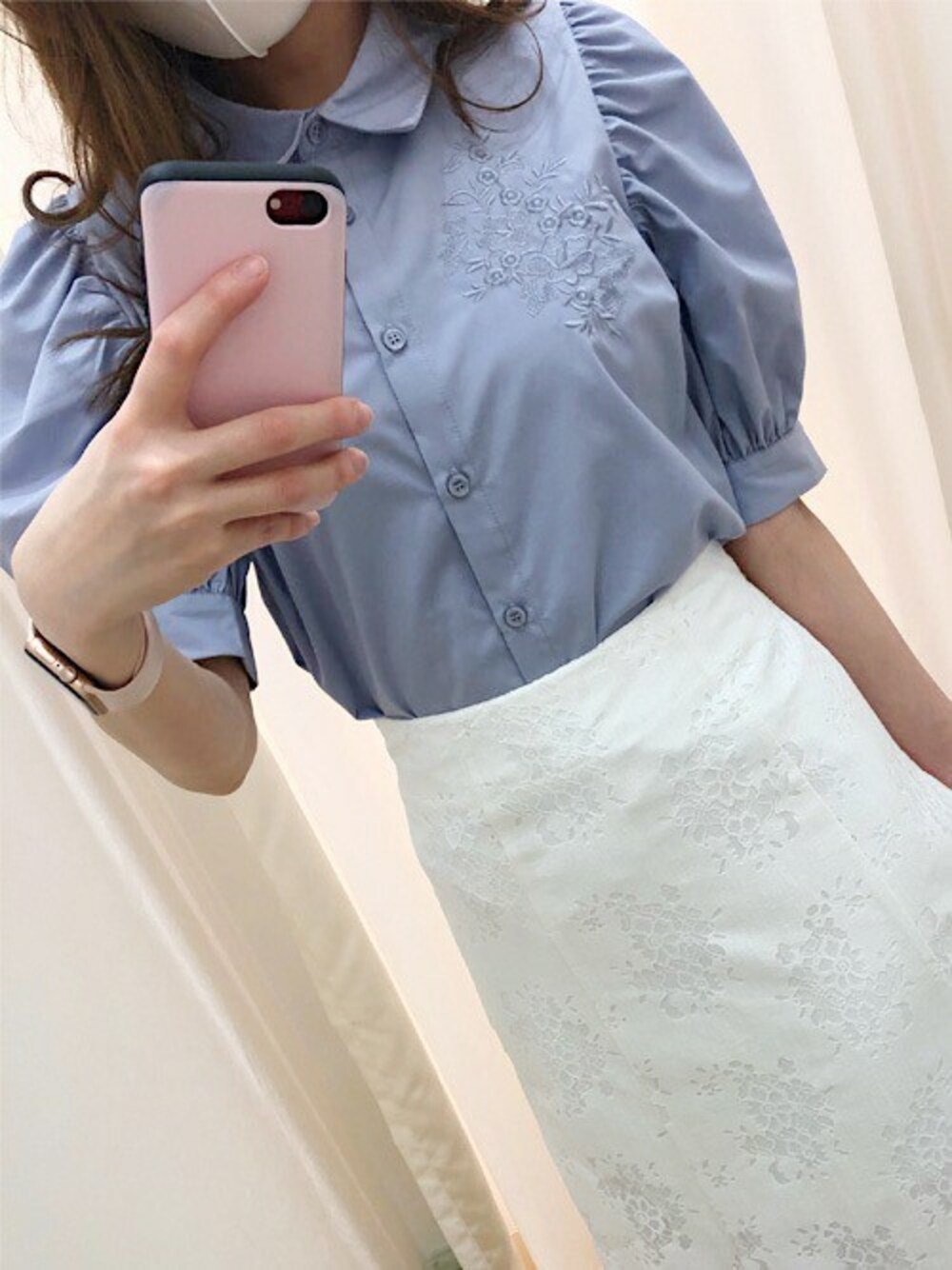 袖にボリュームのあるブラウス×マーメイドスカートでシルエットが綺麗に見えます♪胸元の刺繍がコーデのワンポイントになります!