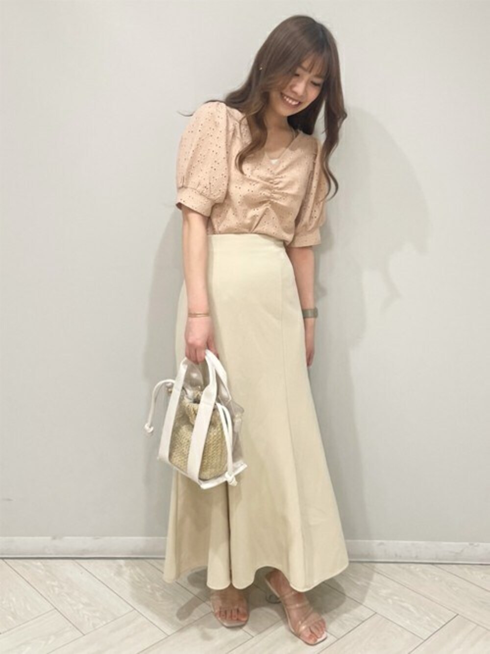 オレンジ×アイボの爽やかビタミンコーデ。肌馴染みの良い色合わせはどなた様でも着用しやすいです。