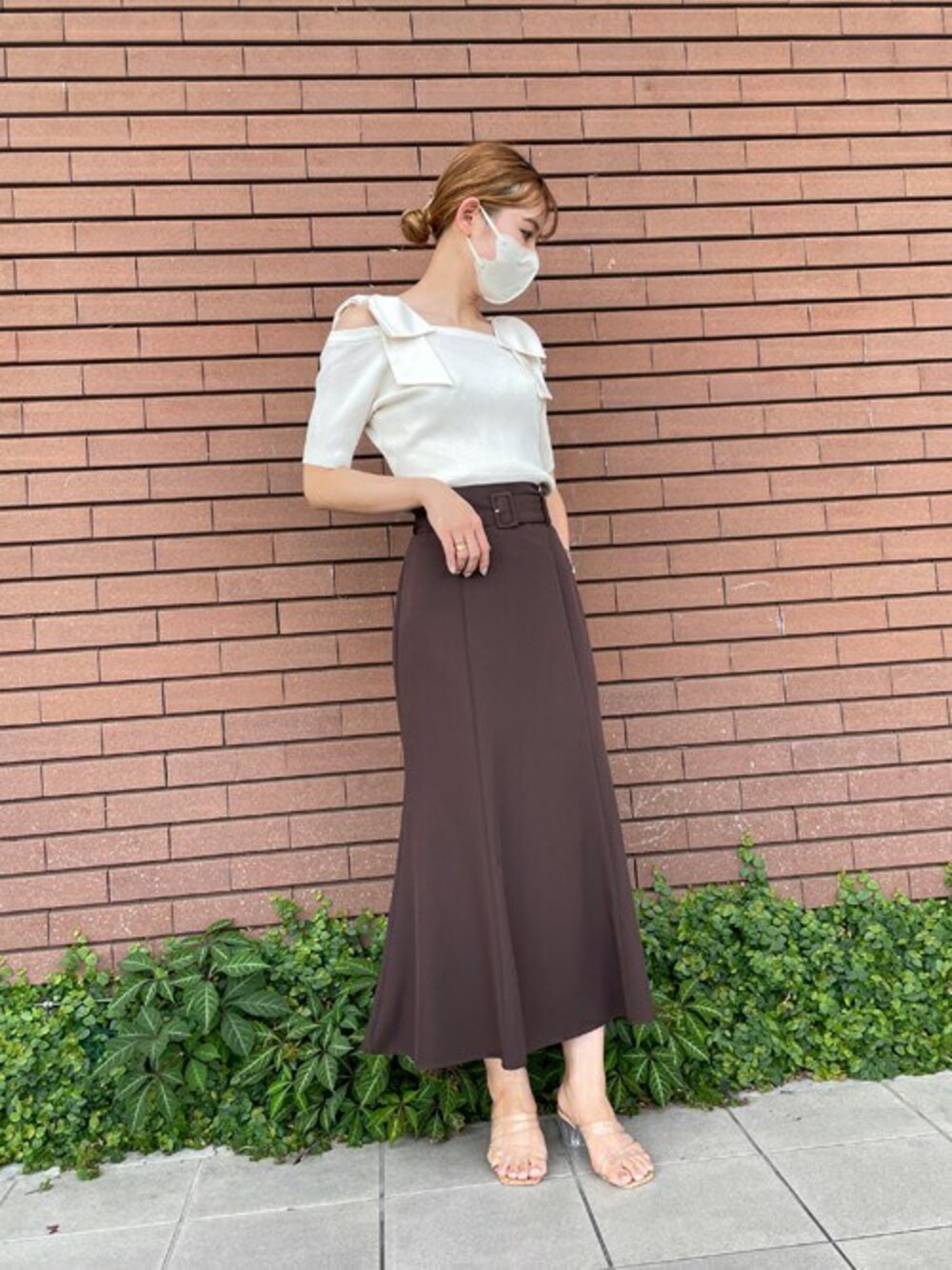 肩のリボンがアクセントで可愛いリブニットです♩マーメイドスカートで合わせ、スッキリとした印象になるコーデにしました◎
