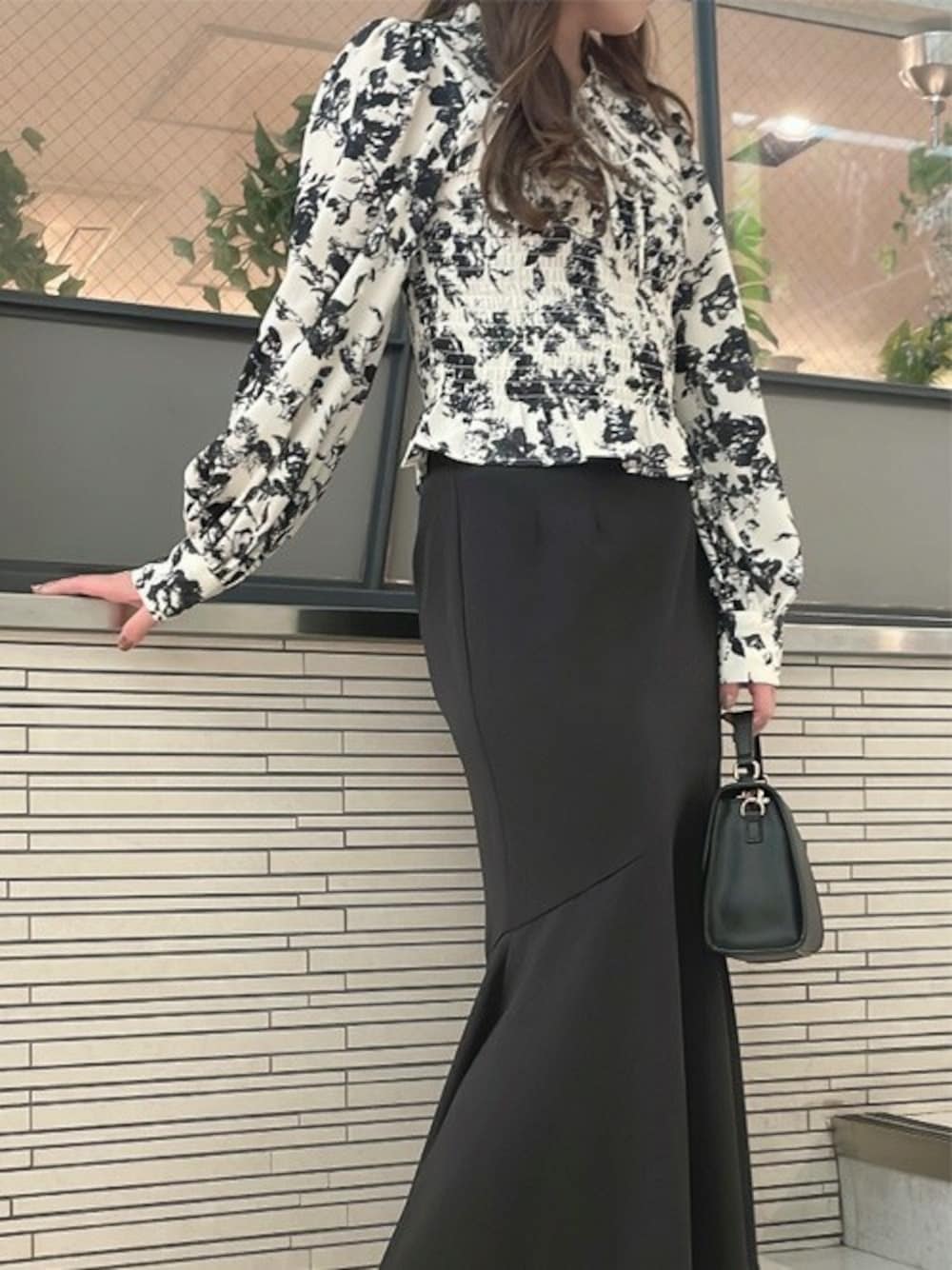 遠くからでも目を引く花柄が可愛いTOPSです。モノトーンで大人な印象のコーディネートにしてみました。