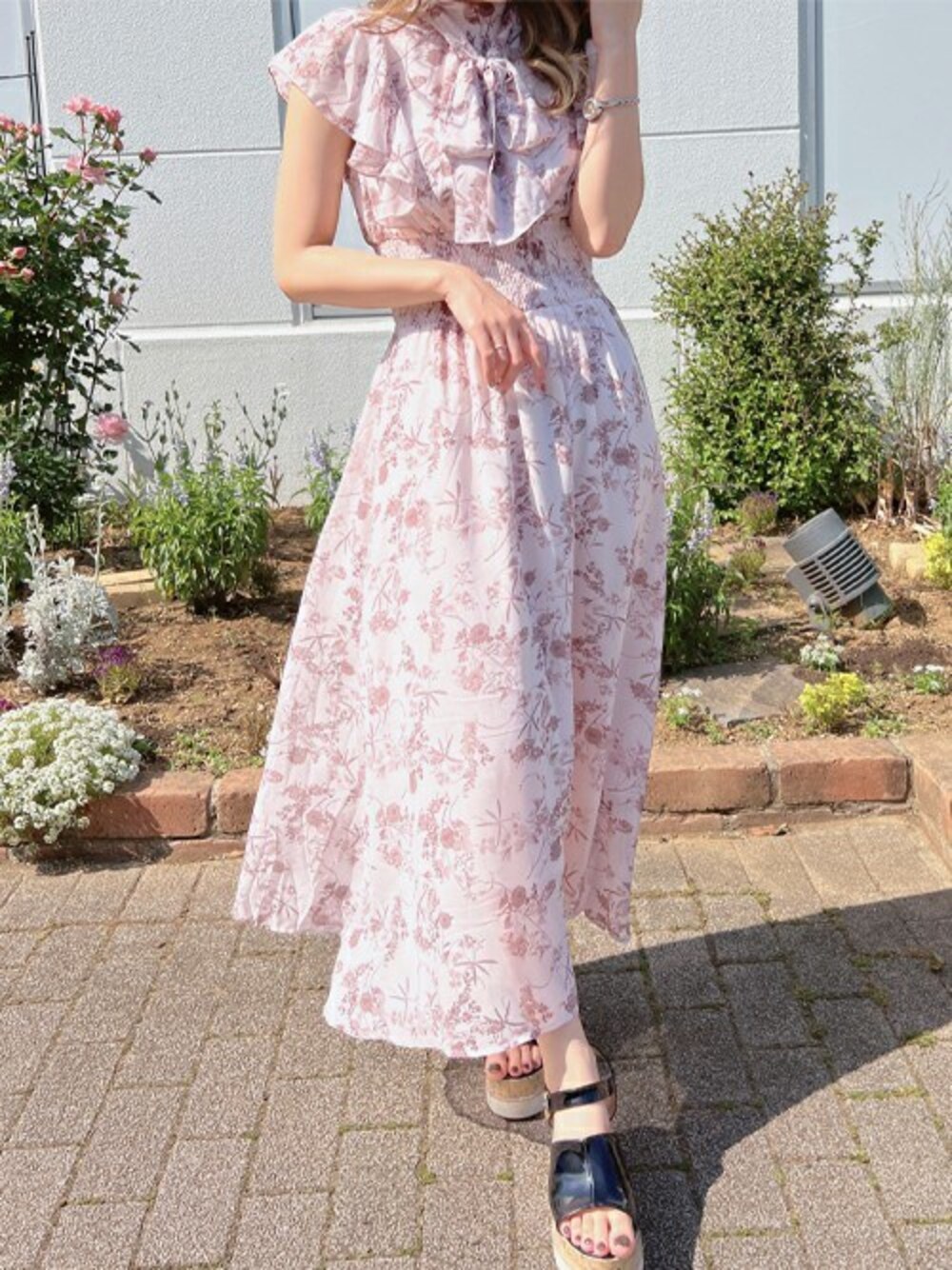 上品なデザインのフラワープリントや肩のフリルなどエレガントな印象の花柄ワンピース。 ウエストのゴムが高い位置に入っているのでスタイルアップ効果抜群です◎