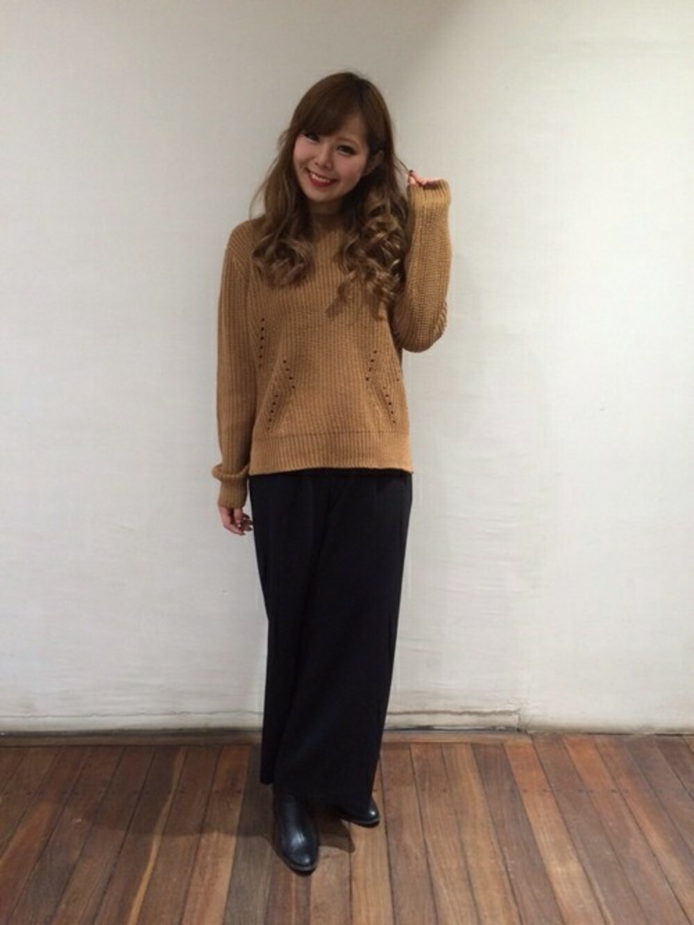 今季大注目のワイドパンツを取り入れたこれからの季節にピッタリのコーディネート。ワイドシルエットで脚長効果抜群♩♩ニットはキャメルで秋らしさをプラスしました!