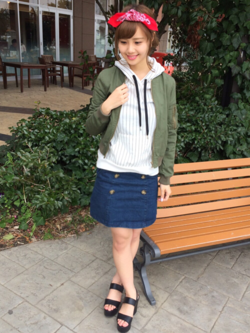 赤のバンダナをアクセとして使うと一気に華やかに★レトロな台形スカートを合わせて70年代風コーデ♩大人気のMA-1は丈が短めなのでハイウエストのボトムやワンピースとも相性抜群です!