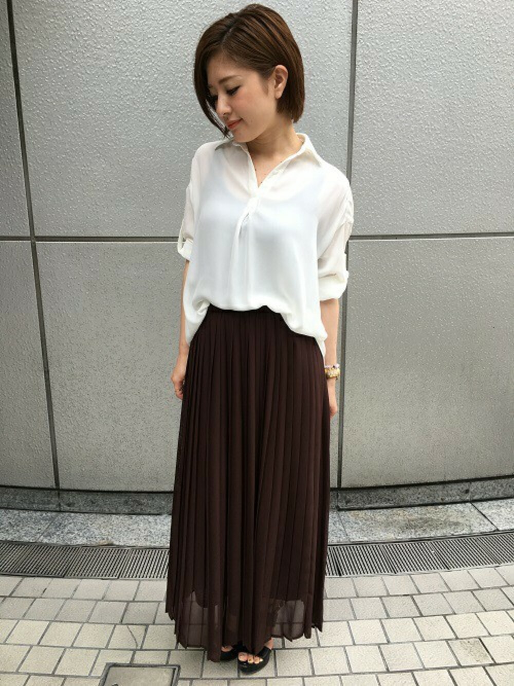 大きすぎない襟の開きが上品なスキッパーシャツは裾が前後差になっており一枚でオシャレに見えます。袖をロールアップしてまだまだ着られるのもポイントです。 プリーツスカートと合わせて、きちんとした印象にしました。"