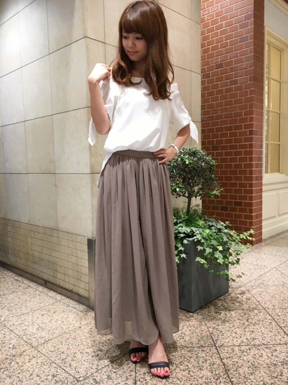 今年マストアイテムのオフショルトップスです!袖のリボンがポイントになっており、後ろの丈が長いので腰回りをカバーできます! トップスのオフホワイトを引き立たせるライトブラウンのロングボトムを合わせて大人可愛くコーディネートしました!