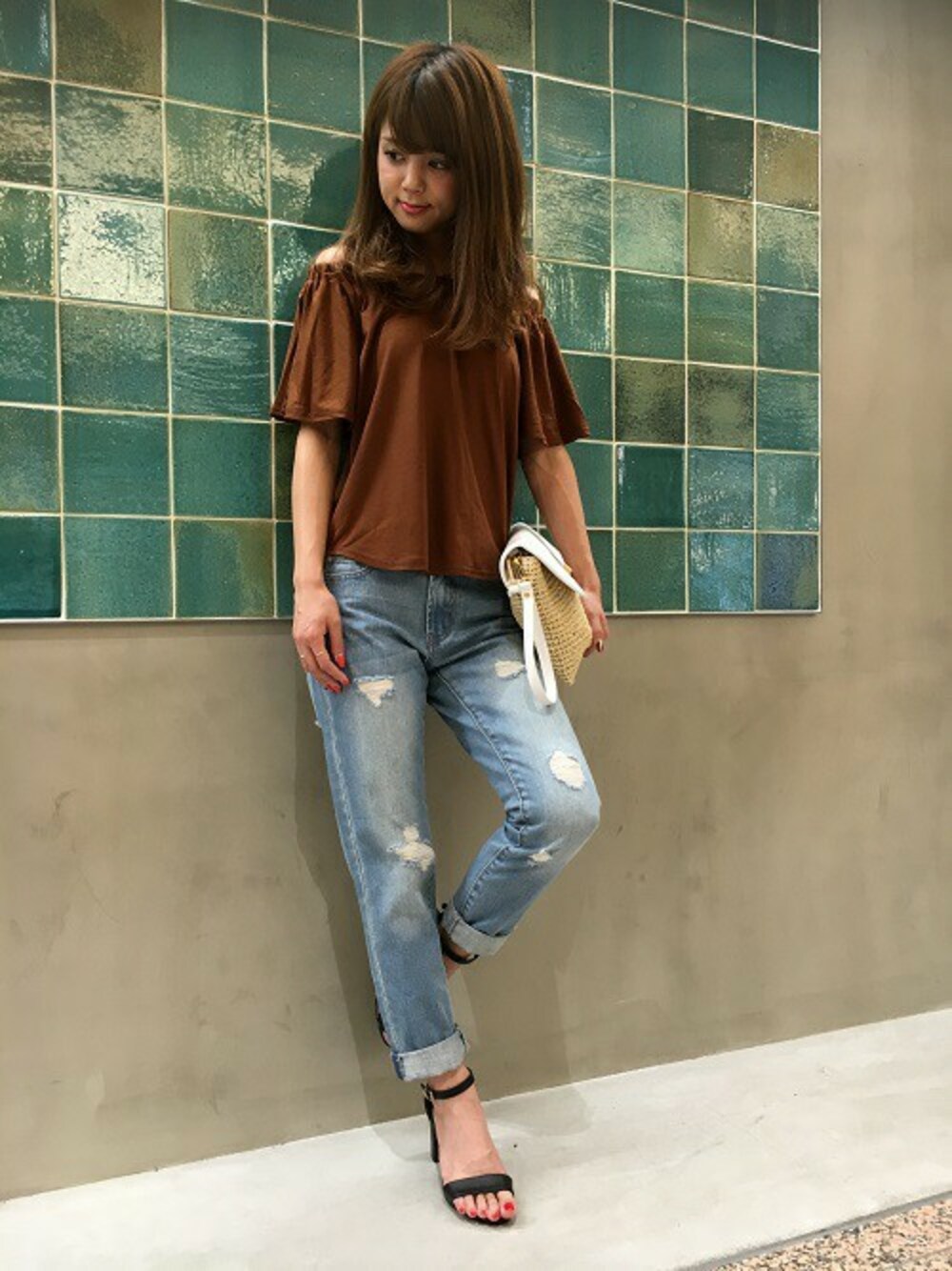 今年人気のオフショルのデザインで、柔らかい素材で着心地抜群です!袖に向かって広がる形なので腕回りをすっきり見せてくれます。 オフショルトップスにはデニム合わせがオススメです!ペーパークラッチを持って夏らしくコーディネートしました!
