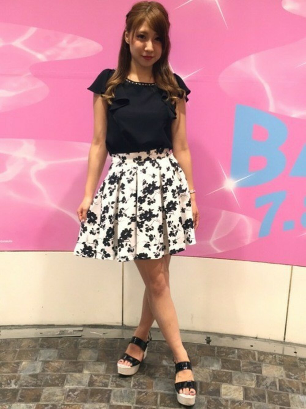 パーティーシーンにも使えるフリルトップスは衿元装飾付で1枚で華やかに着ていただけます♡ モノトーン花柄のスカートと合わせて大人SWEETなスタイリングに仕上げました!