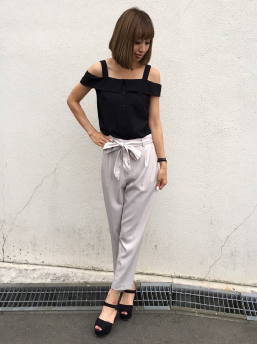トレンドの肩あきトップス☆肩の開き具合がかわいいデザインです☆ ボトムにこちらも注目のグレージュを合わせて甘さを抑えた大人キレイめコーディネートにしてみました♪