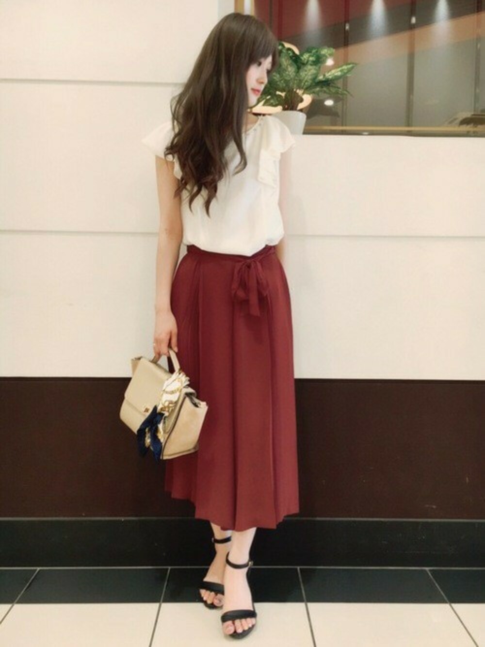 上下軽やかな素材のアイテム トップスの襟元には装飾、ボトムはサッシュ付と嬉しいポイントが詰まっています♪ トップスの裾をボトムにINするスタイルで脚長効果! 秋見えするボルドーのカラーは、スタイルが上品に決まります♡