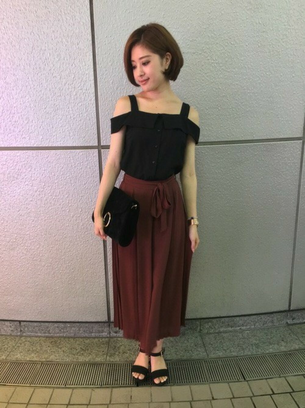 .オフショルブラウスは襟付きのデザインで品よくお召しになれます。 ガウチョは秋も引き続きトレンドのトロミ素材で柔らかくサラサラして着心地抜群です。 色味で秋を先取りしたのに加え、小物をベロア素材にして、更に秋らしさをプラスしました。