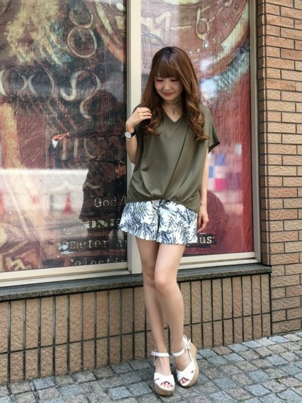 ゆったりとしたドルマンTOPSは普段使いにぴったり! 裾にタックが入っているので、着るだけでトレンドの後ろ下がりスタイルが完成です! +リーフ柄のショートパンツで夏っぽさup☆