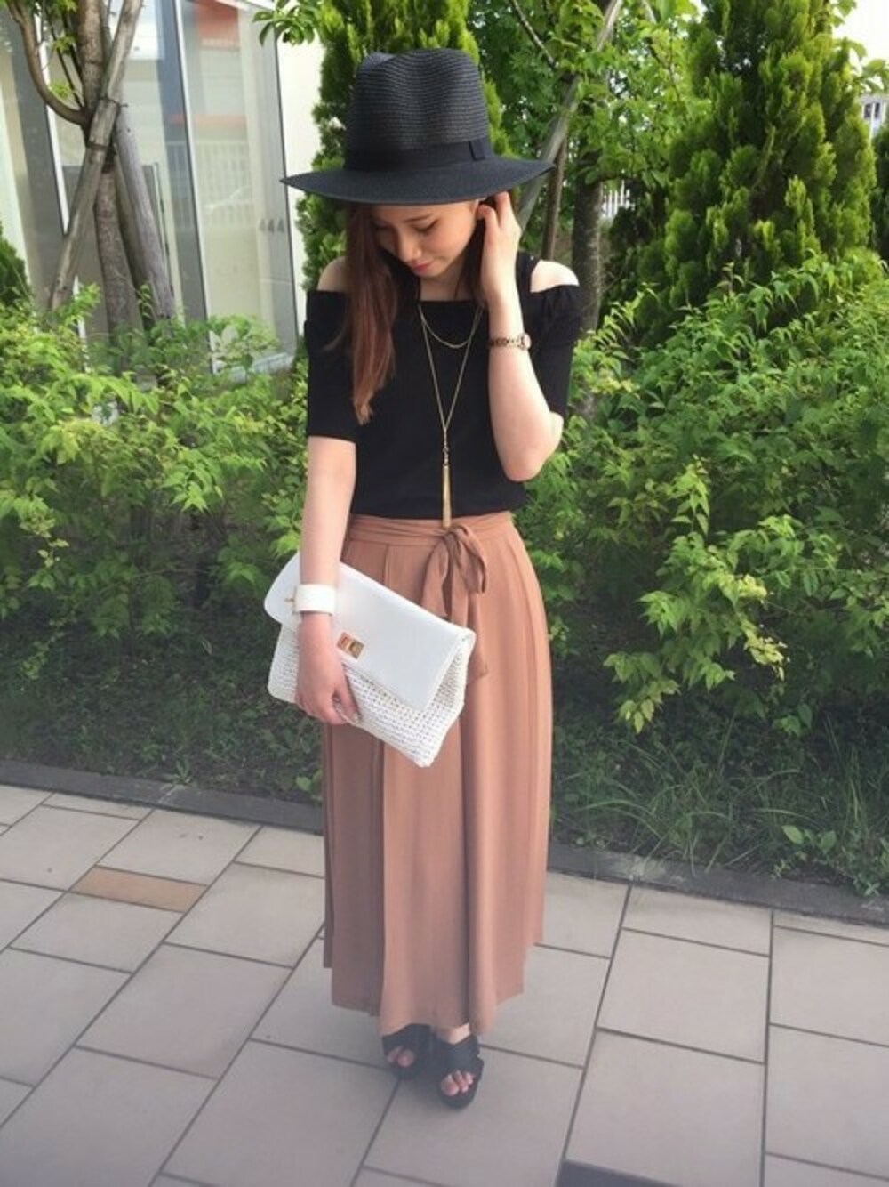 今年流行りのオフショルアイテム。 肩紐がついてるのでずり落ちる心配もありません。 サッシュのリボンあわせで女らしさを強調しました。