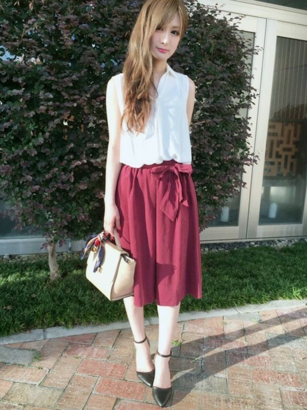 サラッとした軽やかな着心地のシャツは、夏を爽やかにすごせるアイテム! ボトムには膝丈スカートに合わせて大人レディな着こなしに♪ ピーチ起毛素材+ボルドーカラーで秋の先取りも出来ます♡