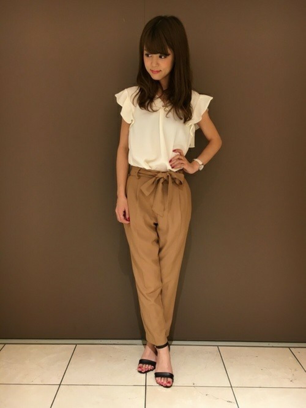 ラッフルスキッパーシャツはポリエステル100%使用しておりますのでサラッとした着心地が特徴です! 前結びのテーパードパンツと合わせて大人可愛くコーディネートしました!