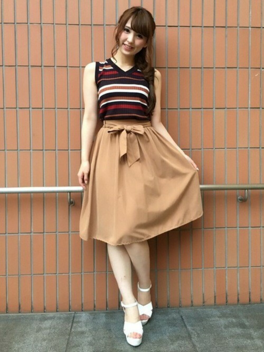マルチボーダーのノースリニットとピーチミディスカートで秋を取り入れたコーディネートです♡ ミディスカートはボリュームがあるのでトップスはコンパクトにまとめるのがオススメです!