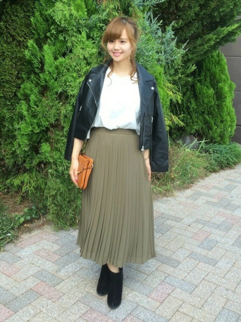 秋を先取りしてライダースを合わせてみました♪ シフォンのプリーツスカートは動くたびにふんわり揺れて女の子らしさも出してくれます。