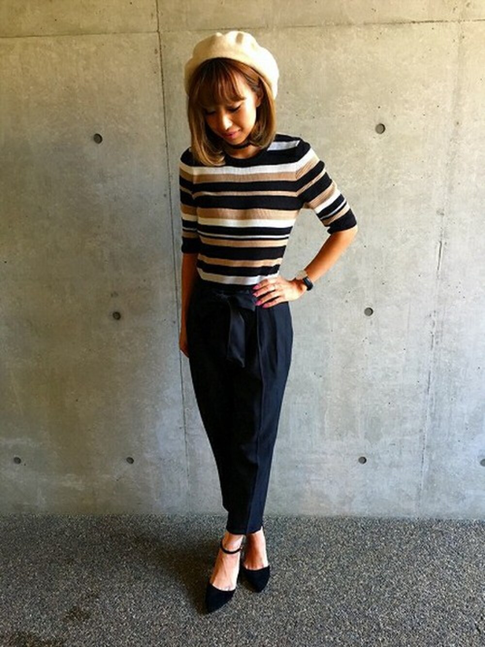 マルチボーダーをメインにレトロなスタイルにしてみました☆流行りのベレーを合わせて今っぽく.+*パンツはウエストに余裕があり動きやすく、タックがしっかり入っているのでスッキリ見える優れもの!トップスインしてスタイルアップ効果試してみてください♪