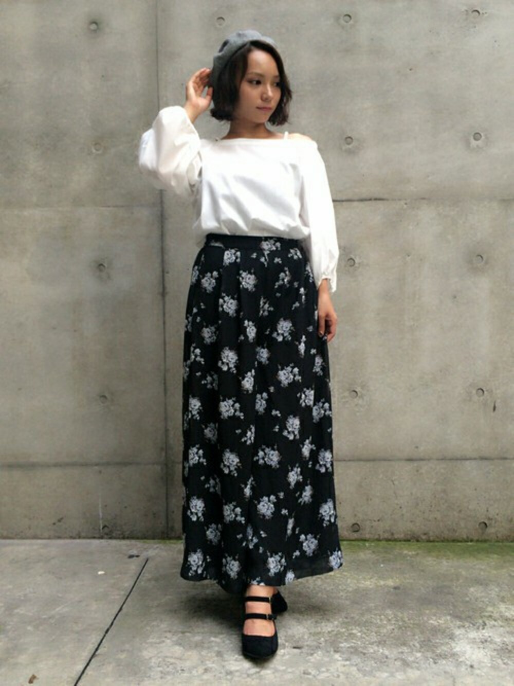 袖のボリュームが可愛いトップスはストラップ付きのオフショルのため露出しすぎず、オシャレに見せてくれます。 モノトーンベースの柄スカンツと合わせれば、トレンド秋コーデの完成です。