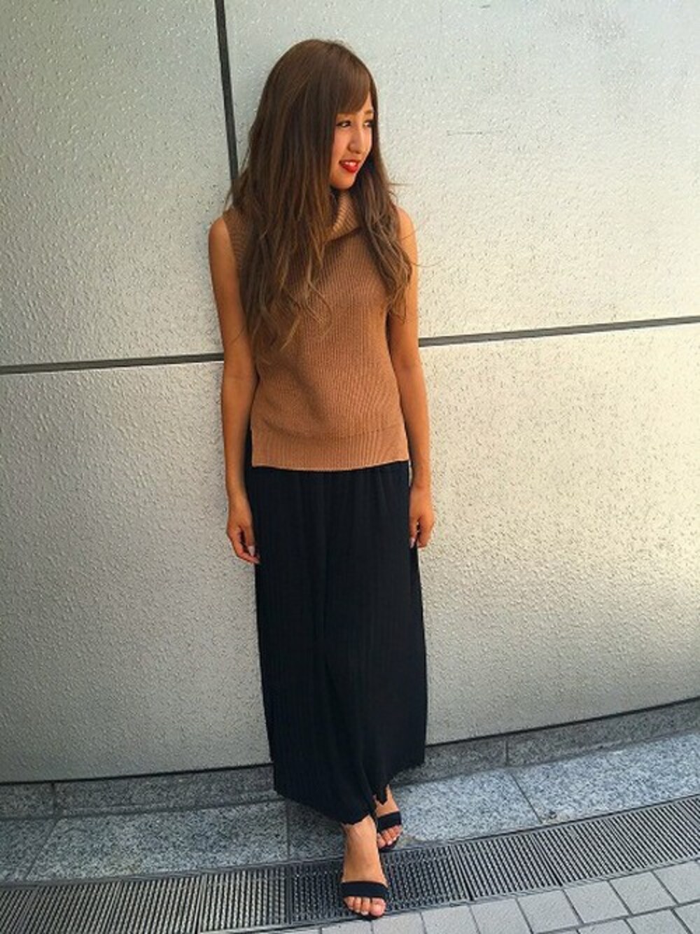今年流行しておりますシフォンのプリーツスカンツは生地がとても柔らかいので履きやすいのと、ふわっと揺れるシルエットが特徴です! 毎年流行のノースリニットは程よくボリュームのあるオフタートルなので顔周りをスッキリ見せてくれます!さらにシフォンのスカンツを合わせることで綺麗めコーディネートが出来上がります!