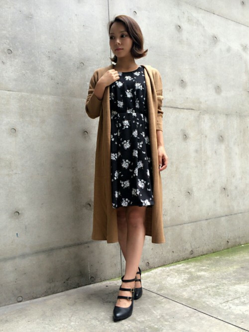 ウエストの切り返しが細身に見せてくれるワンピ。 モノトーンベースに派手過ぎない花柄が入っているので、大人可愛く着こなせます!! 羽織り物では今年はロングカーデがオススメ♡