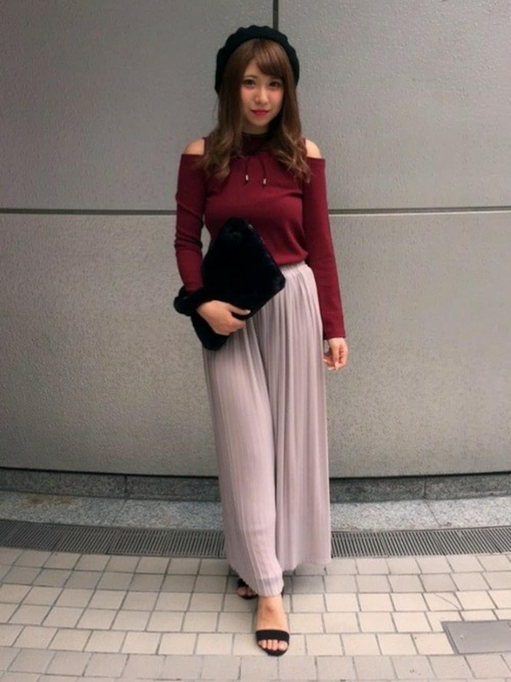 .ボルドーの肩あきトップスはチラ見せ肌がとても可愛く、伸縮性のある素材でとても着やすいです♪ グレーのお色みと合わすと柔らかい雰囲氣になり、大人可愛い着こなしに♡ プリーツスカンツはシワになりにくいので普段使いしやすいアイテムです!
